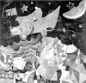 into an imaginary world where red scissors, UFOs, helicopters, airplanes, and tanks come