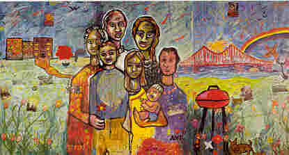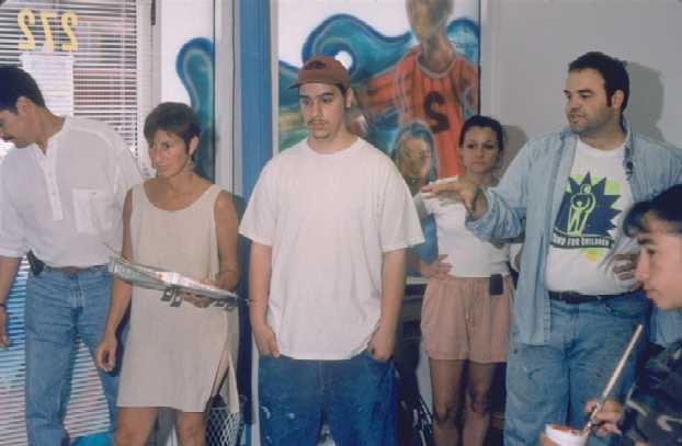 Bodega solicited the ideas from youth who participated in focus groups and developed a pictorial assessment of their neighborhood. These kids interviewed friends, family, teachers and police, asking them to discuss how they feel "connected" to their community. According to Cortada, "the youth served as liaisons to bring voices of other individuals in the community to the mural." Their efforts included outreach to others in the community, asking them to express themselves in writing or drawings that will then be incorporated to the mural. On June 27th and 28th, 1997, Cortada returned to the Bodega to work with youth in sketching and then painting the images on the community mural, integrating the drawings and writings from members of the neighborhood as a whole. In the end, the mural served as a mirror, reflecting today's "sense of community" as perceived by those who are determine the community's future tomorrow. From an agency perspective, the mural development process, which came about from a series of planning meetings between the artist and Bodega staff since November 1997, also served to develop youth-driven community outreach and integration strategies which are aimed to develop a brighter future.
