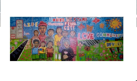 They developed the concept, creating artwork depicting an image of a healthy, drug-free multicultural community with all ethnicities and ages represented at the center of the mural. They surrounded the "community" of people with images of the positive representations of Homestead- Harris Field, their image of teamwork, drive, energy, commitment and Homestead Hospital, their image of peace, healing, good health. Next, they randomly placed thought provoking words throughout the artwork capturing the message they wish to portray- Peace, Hope, Love, Family, Happiness, Freedom, together with words written in native tongues "hola," "welcome," "sak passé."