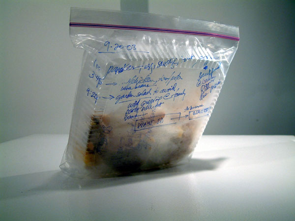 Xavier Cortada, WAIST-ED: September 20, 2003, uneaten food, clear plastic bag, permanent marker, 2003 (www.cortada.com).