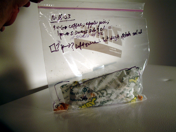 Xavier Cortada, WAIST-ED: October 16, 2003, uneaten food, clear plastic bag, permanent marker, 2003 (www.cortada.com).