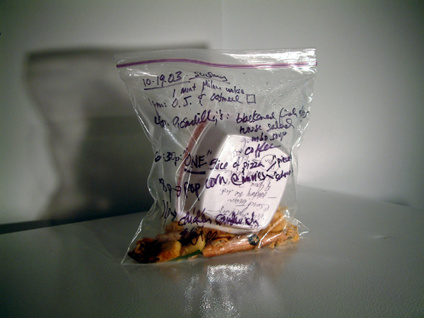 Xavier Cortada, WAIST-ED: October 19, 2003, uneaten food, clear plastic bag, permanent marker, 2003 (www.cortada.com).