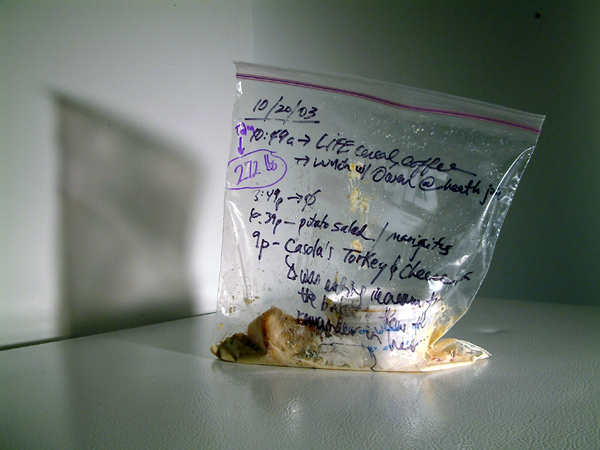Xavier Cortada, WAIST-ED: October 20, 2003, uneaten food, clear plastic bag, permanent marker, 2003 (www.cortada.com).