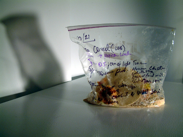 Xavier Cortada, WAIST-ED: October 21, 2003, uneaten food, clear plastic bag, permanent marker, 2003 (www.cortada.com).