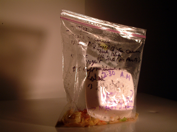 Xavier Cortada, WAIST-ED: October 24, 2003, uneaten food, clear plastic bag, permanent marker, 2003 (www.cortada.com).