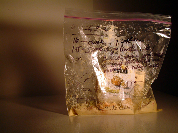 Xavier Cortada, WAIST-ED: October 25, 2003, uneaten food, clear plastic bag, permanent marker, 2003 (www.cortada.com).