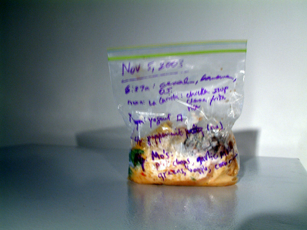 Xavier Cortada, WAIST-ED: November 5, 2003, uneaten food, clear plastic bag, permanent marker, 2003 (www.cortada.com).
