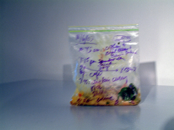 Xavier Cortada, WAIST-ED: November 6, 2003, uneaten food, clear plastic bag, permanent marker, 2003 (www.cortada.com).