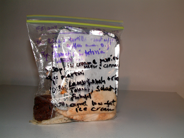 Xavier Cortada, WAIST-ED: November 14, 2003, uneaten food, clear plastic bag, permanent marker, 2003 (www.cortada.com).