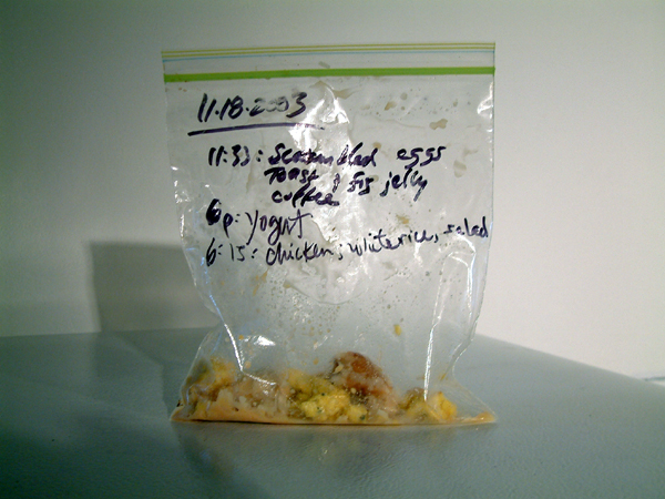 Xavier Cortada, WAIST-ED: November 18, 2003, uneaten food, clear plastic bag, permanent marker, 2003 (www.cortada.com).
