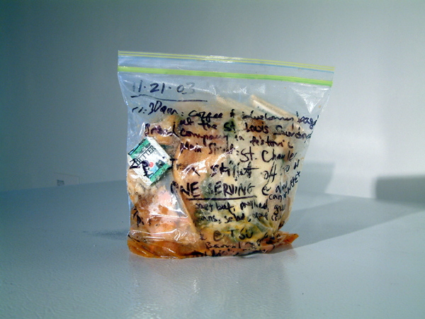 Xavier Cortada, WAIST-ED: November 21, 2003, uneaten food, clear plastic bag, permanent marker, 2003 (www.cortada.com).