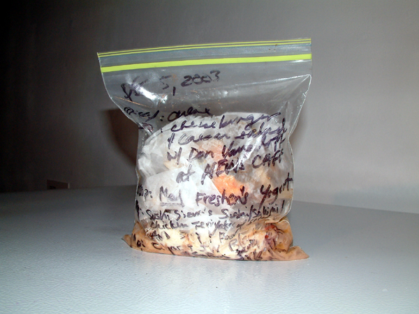 Xavier Cortada, WAIST-ED: December 5, 2003, uneaten food, clear plastic bag, permanent marker, 2003 (www.cortada.com).