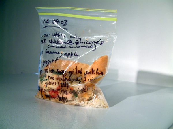 Xavier Cortada, WAIST-ED: December 9, 2003, uneaten food, clear plastic bag, permanent marker, 2003 (www.cortada.com).