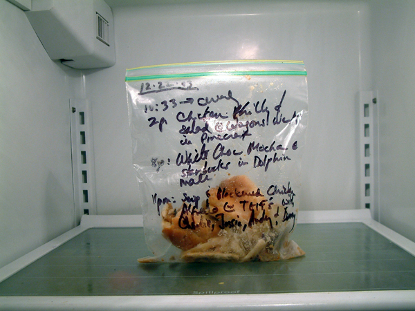 Xavier Cortada, WAIST-ED: December 22, 2003, uneaten food, clear plastic bag, permanent marker, 2003 (www.cortada.com).