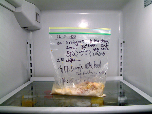 Xavier Cortada, WAIST-ED: December 26, 2003, uneaten food, clear plastic bag, permanent marker, 2003 (www.cortada.com).