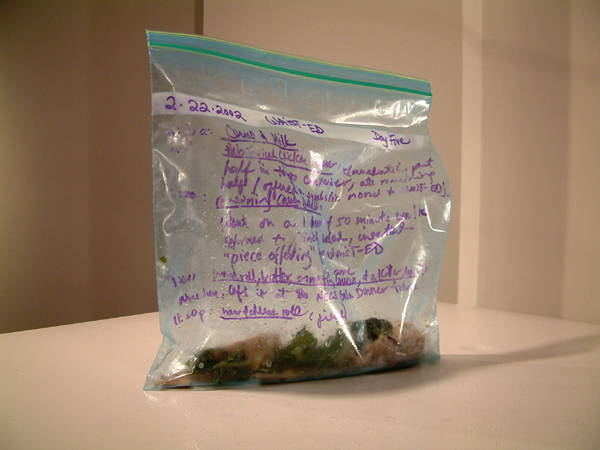 Xavier Cortada, WAIST-ED: February 22, 2003, uneaten food, clear plastic bag, permanent marker, 2003 (www.cortada.com).