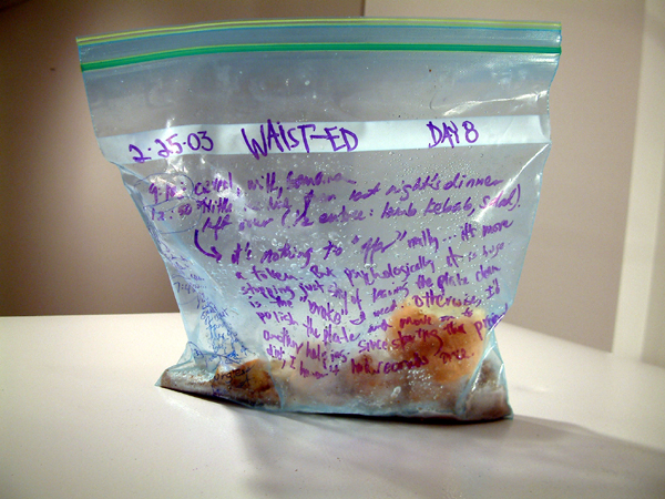 Xavier Cortada, WAIST-ED: February 25, 2003, uneaten food, clear plastic bag, permanent marker, 2003 (www.cortada.com).