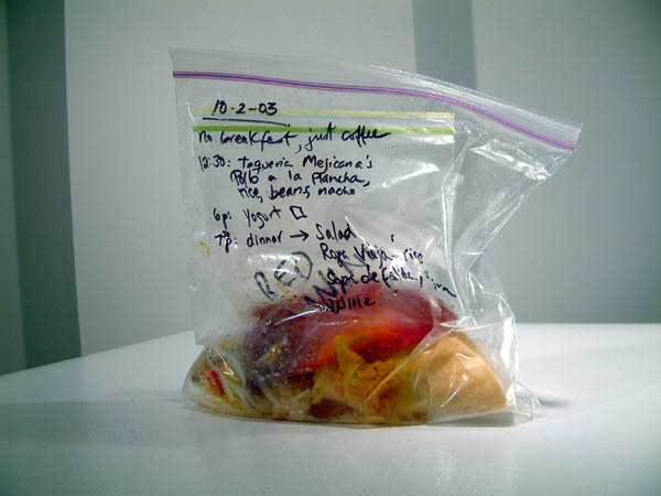 Xavier Cortada, WAIST-ED: October 2, 2003, uneaten food, clear plastic bag, permanent marker, 2003 (www.cortada.com).
