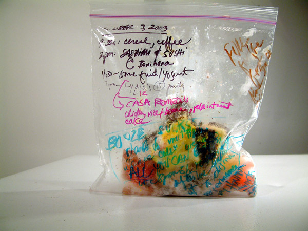 Xavier Cortada, WAIST-ED: October 3, 2003, uneaten food, clear plastic bag, permanent marker, 2003 (www.cortada.com).