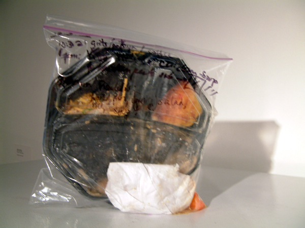 Xavier Cortada, WAIST-ED: December 8, 2003, uneaten food, clear plastic bag, permanent marker, 2003 (www.cortada.com).