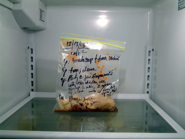 Xavier Cortada, WAIST-ED: December 13, 2003, uneaten food, clear plastic bag, permanent marker, 2003 (www.cortada.com).