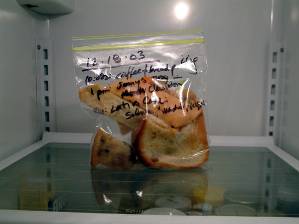 Xavier Cortada, WAIST-ED: December 18, 2003, uneaten food, clear plastic bag, permanent marker, 2003 (www.cortada.com).