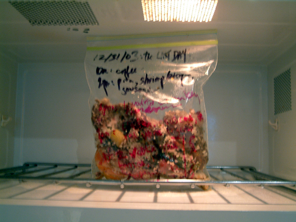 Xavier Cortada, WAIST-ED: December 31, 2003, uneaten food, clear plastic bag, permanent marker, 2003 (www.cortada.com).